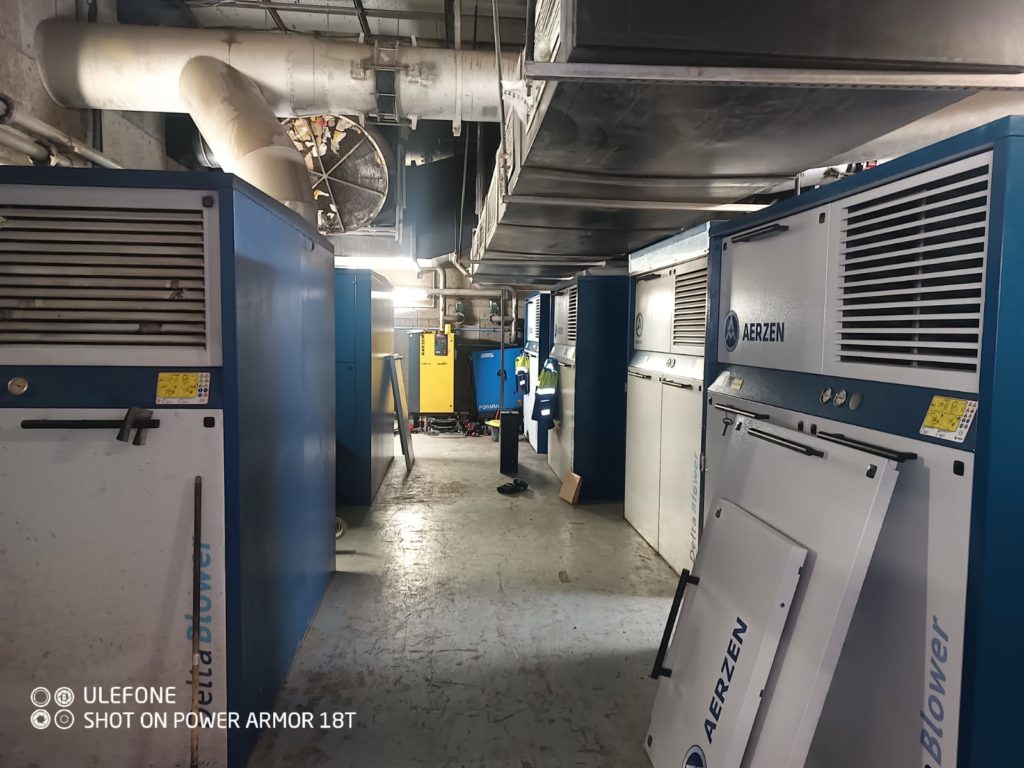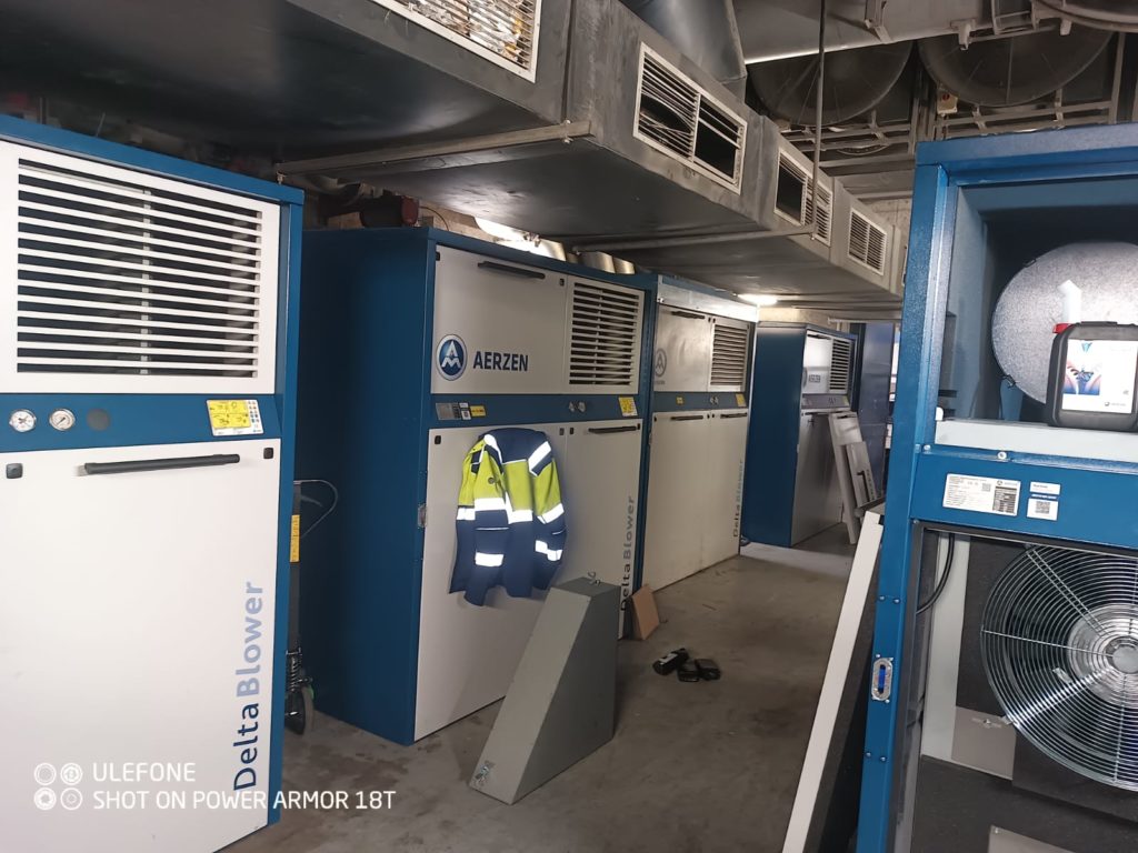 Na wolne 4 stanowiska starych zdemontowanych dmuchaw, montaż nowych dmuchaw GM130L z osłonami akustycznymi i uruchomienie.